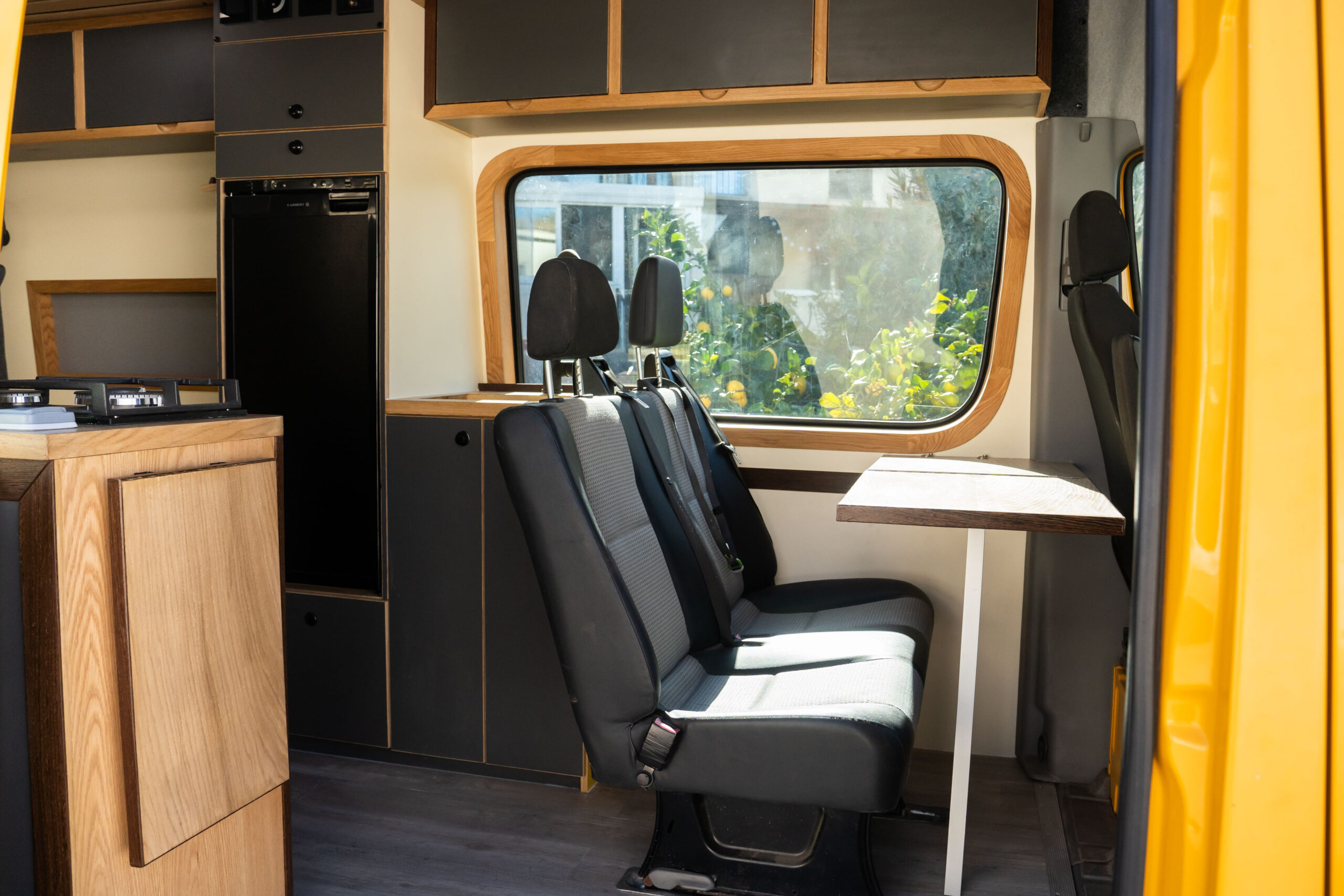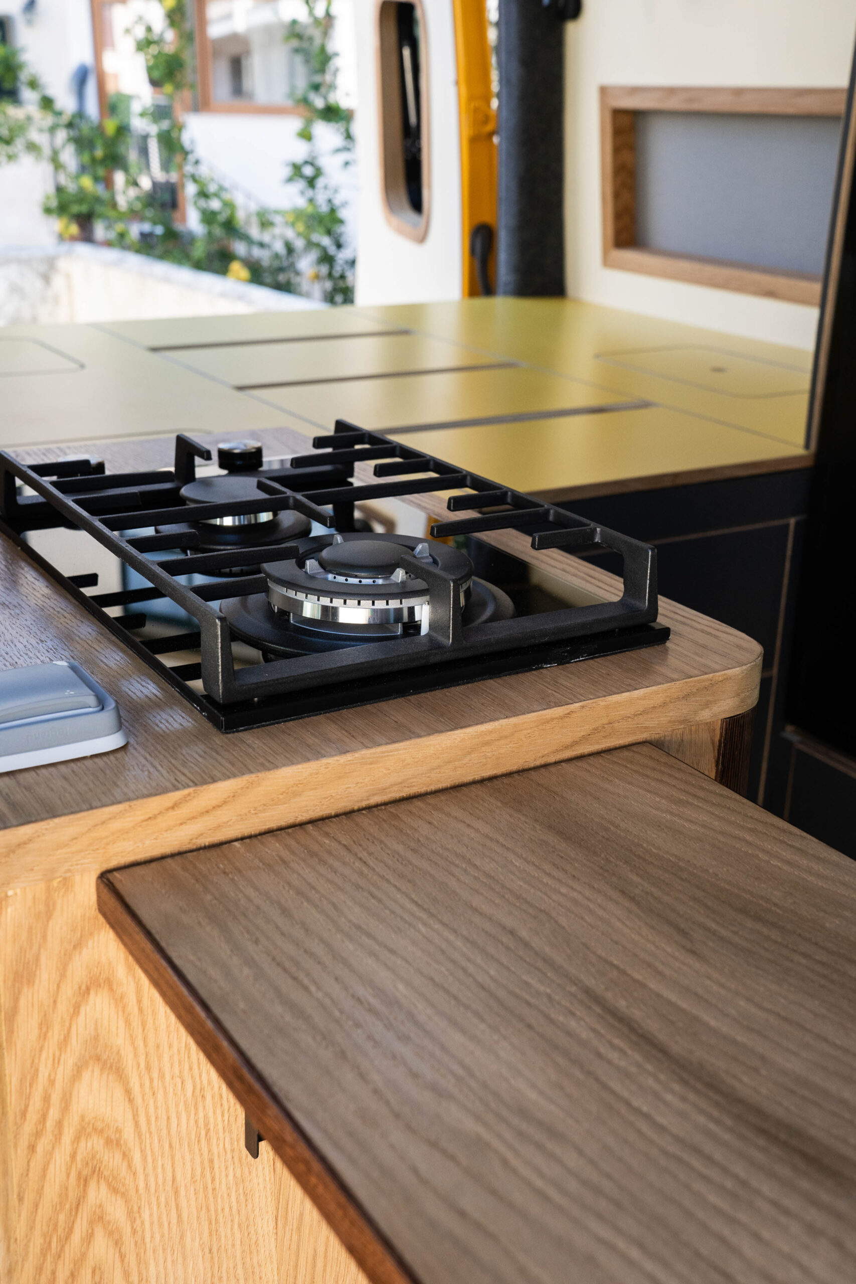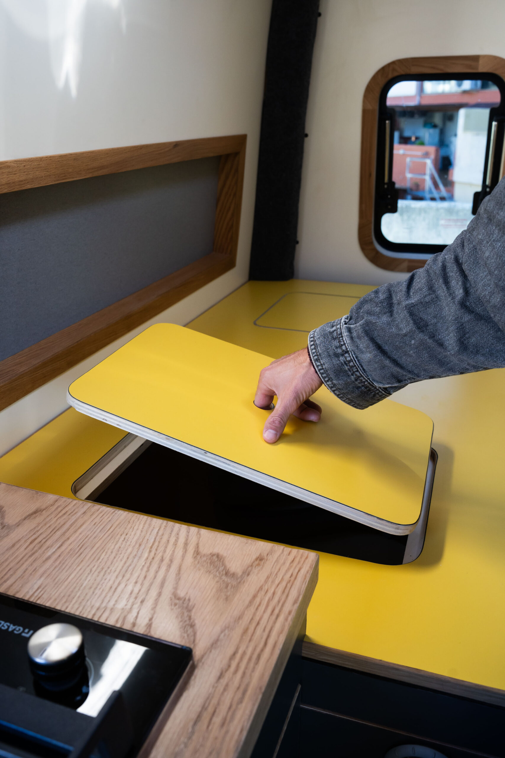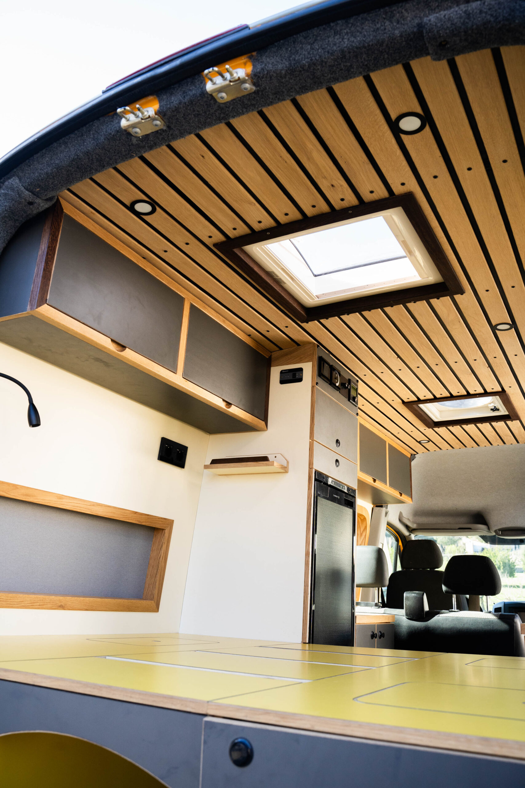 This was the first build from alterna and was based around a boaty design. The panels were individually fabricated and laminated to be hollow, and therefore reduce the weight by approximately a third. We chose a mix of different veneers and laminates to create a functional space with a slick design. Mixed in with some funky curves and warm glow LED lighting, it’s a comfy place to relax and enjoy a nice trip away.